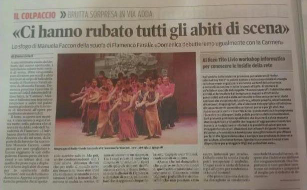 A una settimana dallo spettacolo siamo stati derubati degli abiti di scena, indumenti di pregio e qualità ma, soprattutto, sinonimo di grande valore affettivo. Ne hanno parlato il Mattino di Padova e il Tg di Rete Veneta (nel primo servizio) del 5/2/2013 :